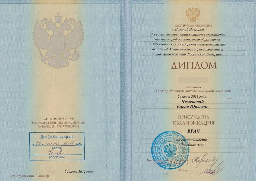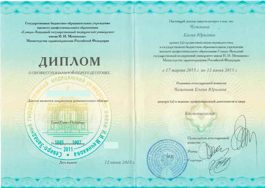 Чемекова Елена Юрьевна в 2011 году окончила Нижегородскую государственную медицинскую академию по специальности "Лечебное дело". В 2012 году в Казанском государственном медицинском университете прошла интернатуру по специальности "Дерматовенерология". В 2015 году прошла профессиональную переподготовку в ГБОУ ВПО СЗГМУ имени И.И. Мечникова по специальности "Косметология".