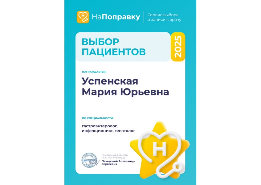 Я нашла своего гастроэнтеролога. Это - Успенская Мария Юрьевна. Очень внимательная, тактичная, доброжелательная, с искренним желанием помочь. При этом профессионал с большой буквы! Наблюдаюсь у неё уже 3 года. Пришла с серьезными проблемами. Назначила обследования, затем грамотное лечение. И вот результат— стойкая ремиссия.Теперь поддерживаю эффект от лечения. Доктор что-то меняет в назначениях, даёт грамотные рекомендации. Всегда на позитиве и вселяет такую же уверенность пациенту. Желаю вам, Мария Юрьевна, самого крепкого здоровья и с низким поклоном за ваше отношение к пациентам.