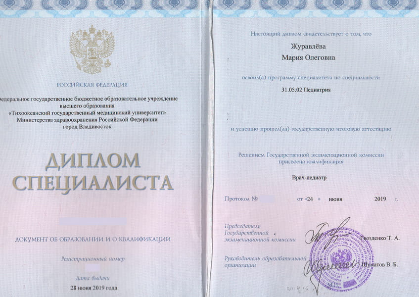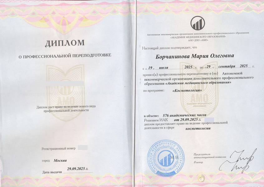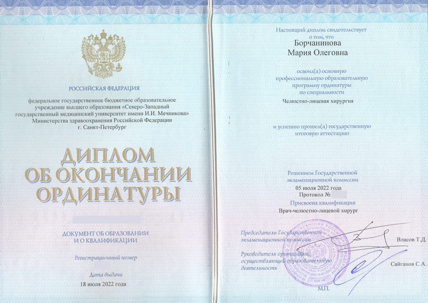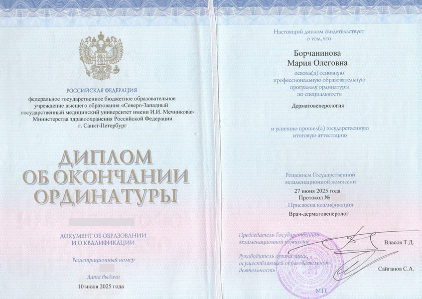Борчанинова Мария Олеговна в 2019 окончила Тихоокеанский государственный медицинский университет (г. Владивосток) по специальности «Педиатрия». В 2022 г. окончила ординатуру по челюстно-лицевой хирургии, в 2025 г. окончила ординатуру по специальности «Дерматовенерология» в СЗГМУ им. И.И. Мечникова и прошла переподготовку по косметологии в АНО ДПО «Академия Медицинского Образования».