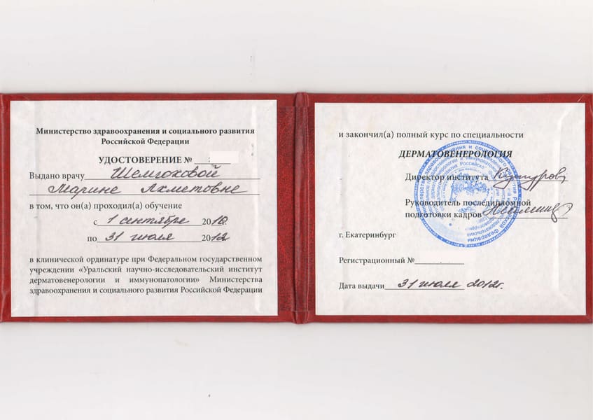 Марина Ахметовна в 2010 г. окончила Сургутский Государственный Университет (г. Сургут) по специальности «Лечебное дело». Ординатуру по специальности «Дерматовенерология» прошла в Уральском научно-исследовательском институте дерматовенерологии и иммунопатологии (г. Екатеринбург, 2010-2012 гг.). В 2015 г. - профессиональная переподготовка по косметологии в Медицинском университете «Реавиз».