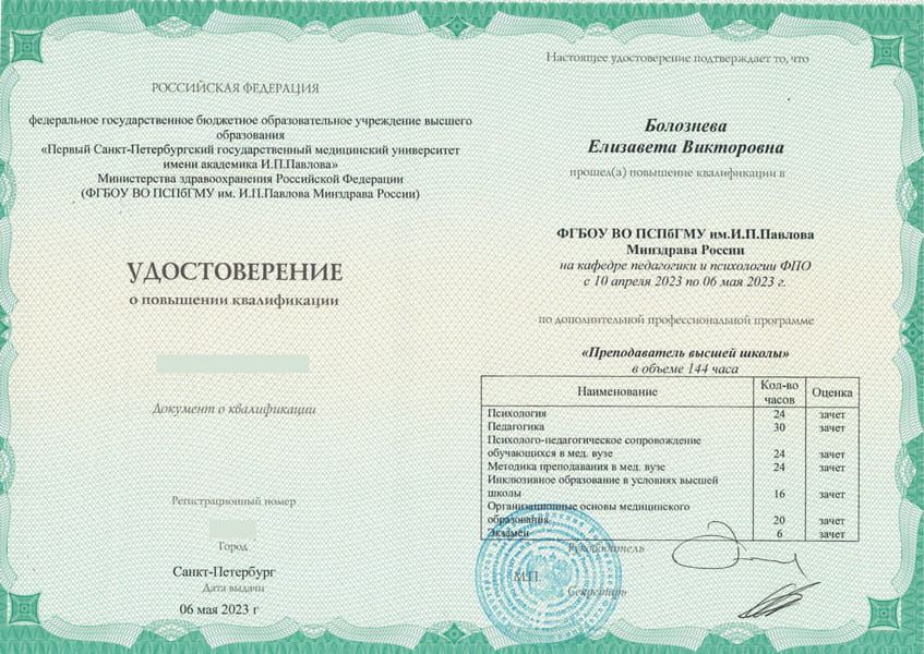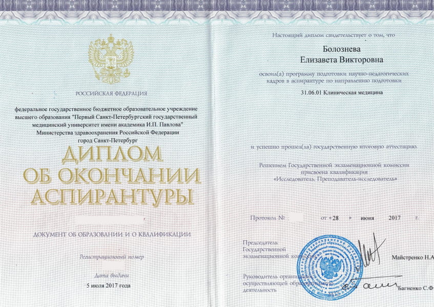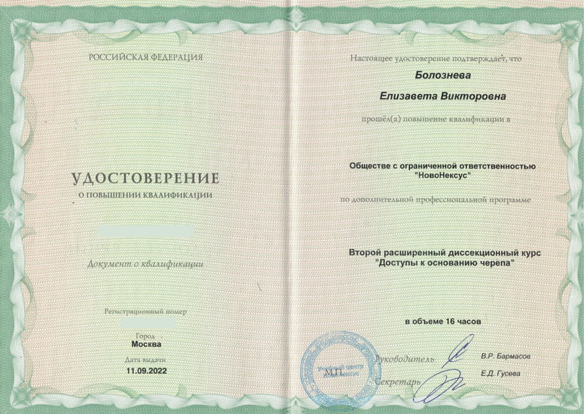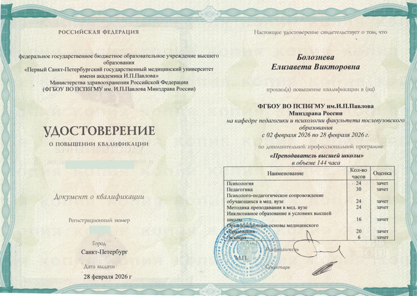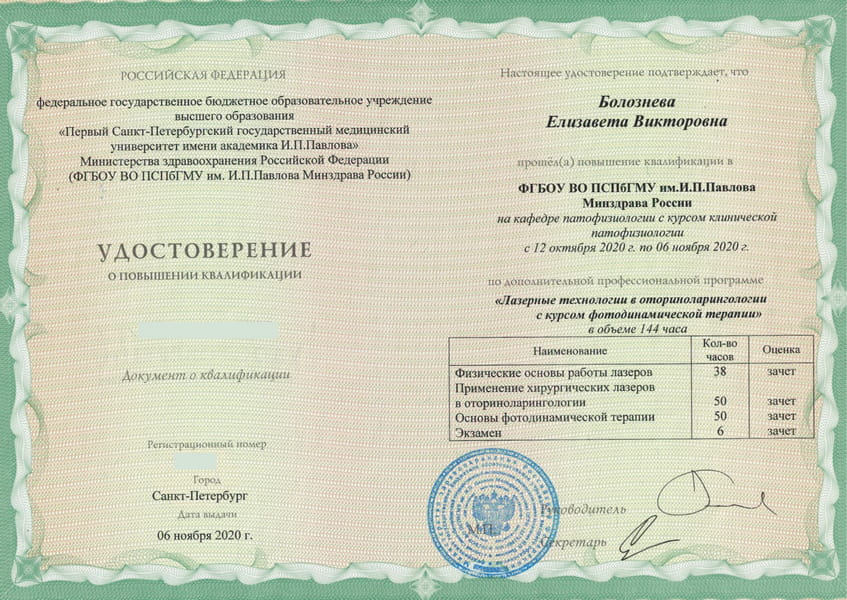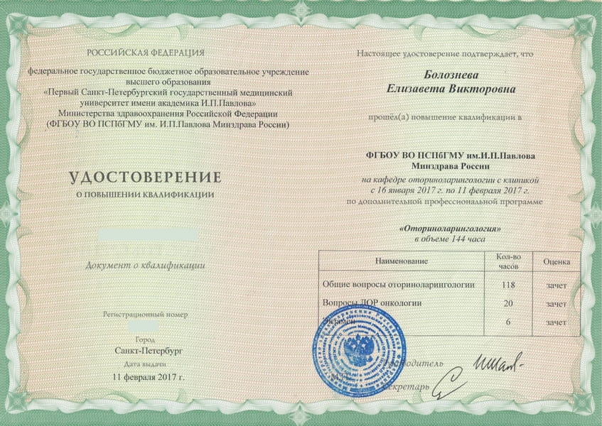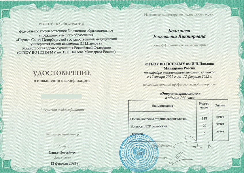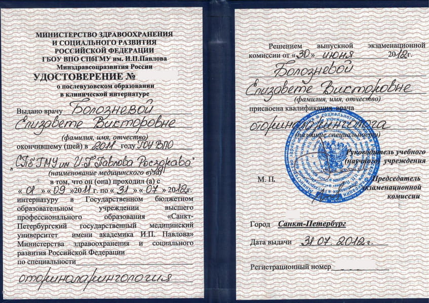 Болознева Елизавета Викторовна в 2011 году окончила Санкт-Петербургский государственный медицинский университет им. акад. И.П. Павлова по специальности «Лечебное дело». Там же прошла интернатуру и ординатуру по оториноларингологии. В настоящее время является ассистентом кафедры оториноларингологии с клиникой ПСПбГМУ. В 2017 году защитила кандидатскую диссертацию «Эндоскопическая эндоназальная хирургия остеом околоносовых пазух». Елизавета Викторовна сочетает клиническую практику с научно-педагогической деятельностью, в т.ч. с 2021 г. является одним из руководителей-преподавателей кадаверного курса по эндоскопической риносинусохирургии для специалистов.