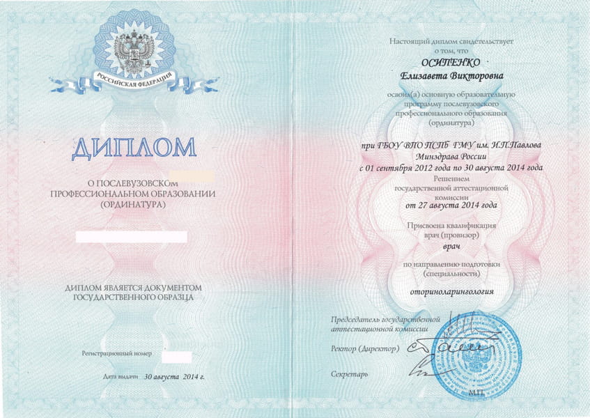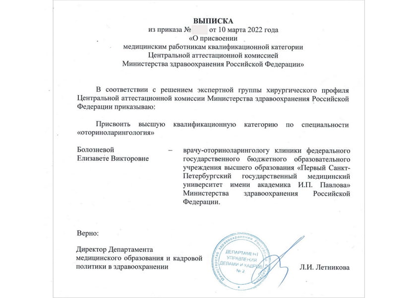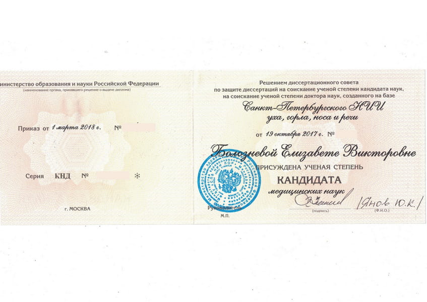 Елизавета Викторовна занимается диагностикой и лечением пациентов с различными нозологическими формами: острый средний отит, хронический тонзиллит, хронический риносинусит, различные заболевания полости носа, носоглотки и околоносовых пазух, стеноз гортани и т.д.