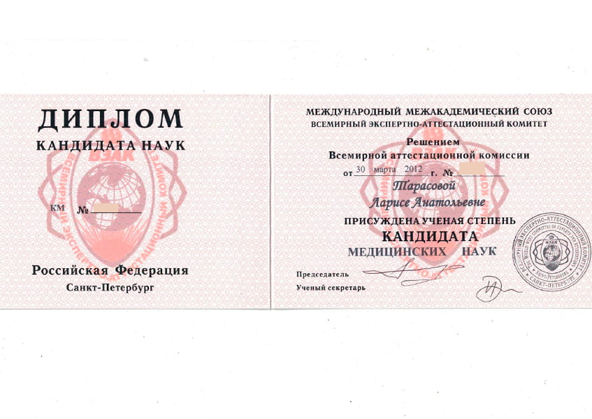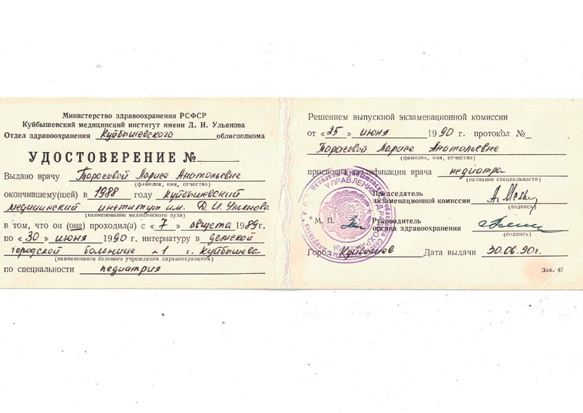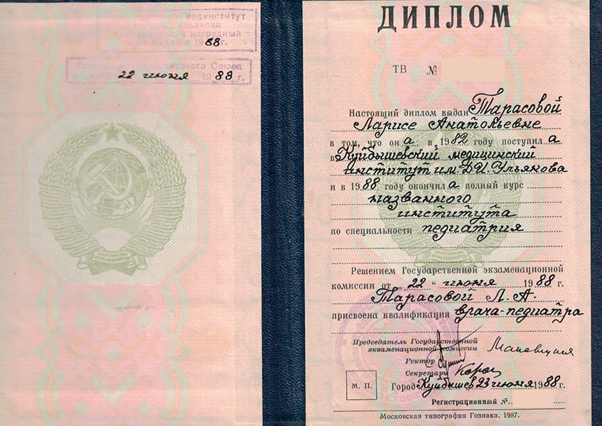 Тарасова Лариса Анатольевна закончила Куйбышевский Медицинский Институт по специальности «Педиатрия» в 1988 году. Интернатуру проходила на базе Детской городской больницы №1, г. Куйбышев, 1990 год. В 2012 году защитила кандидатскую диссертацию на тему «Распространенность протозойно-паразитарных инвазий среди населения Самарской области».