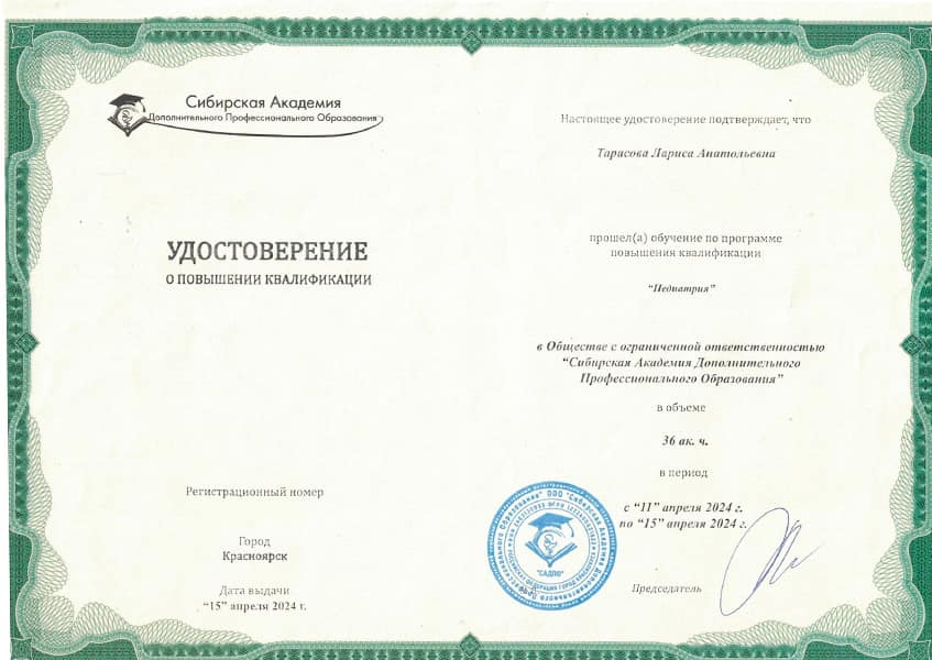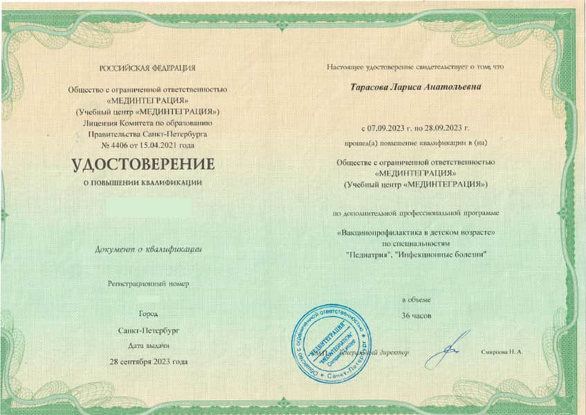 Лариса Анатольевна регулярно проходит обучения и повышения квалификации по своей специальности, из последних: