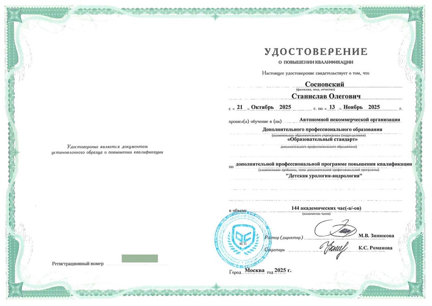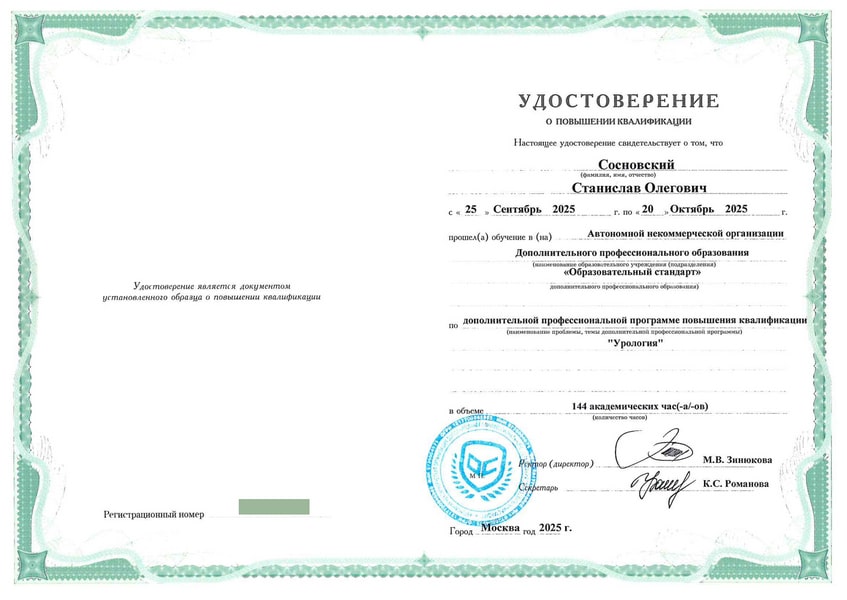 Сосновский Станислав Олегович - выпускник Санкт-Петербургской Государственной Педиатрической Медицинской академии, 2009 год. Работал в КБ №122, активно занимался эндоскопическими операциями (ТУР простаты, уретероскопией, цистоскопией, уретроскопией). В 2017 году прошел повышение квалификации по "клинической урологии" на базе ГМУ им. И.И. Мечникова и цикл "Современные аспекты клинической андрологии". В 2010 г. повышение квалификации на кафедре фтизиурологии МАПО. Активно занимается экстренной урологией на базе ГБ №26. В течение 5 лет занимается международными клиническими исследованиями по протоколу GCP - исследование новых лекарственных препаратов для лечения заболеваний мочеполовой системы.