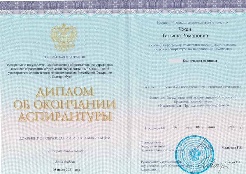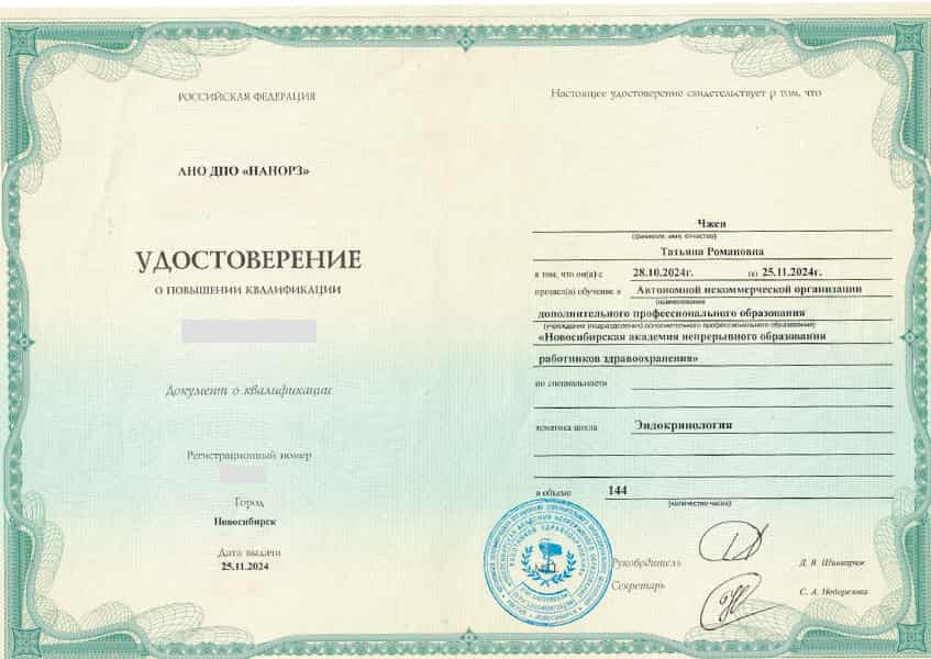 Чжен Татьяна Романовна состоит в ассоциации эндокринологов Санкт-Петербурга и в российской ассоциации эндокринологов.