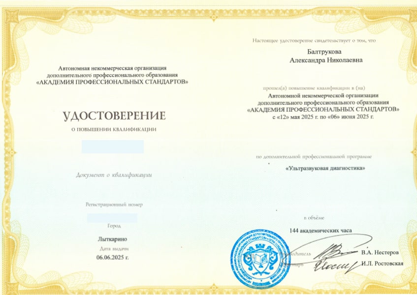 Балтрукова Александра Николаевна окончила ФГБОУ ВО «Северо-Западный государственный медицинский университет им. И.И. Мечникова» в 2012 году. Там же в 2014 году прошла ординатуру по специальности «Акушерство и гинекология». В 2017 году защитила диссертацию по теме «Сравнительный динамический анализ особенностей опухолевого процесса и гормонально-метаболического статуса больных при раке эндометрия».