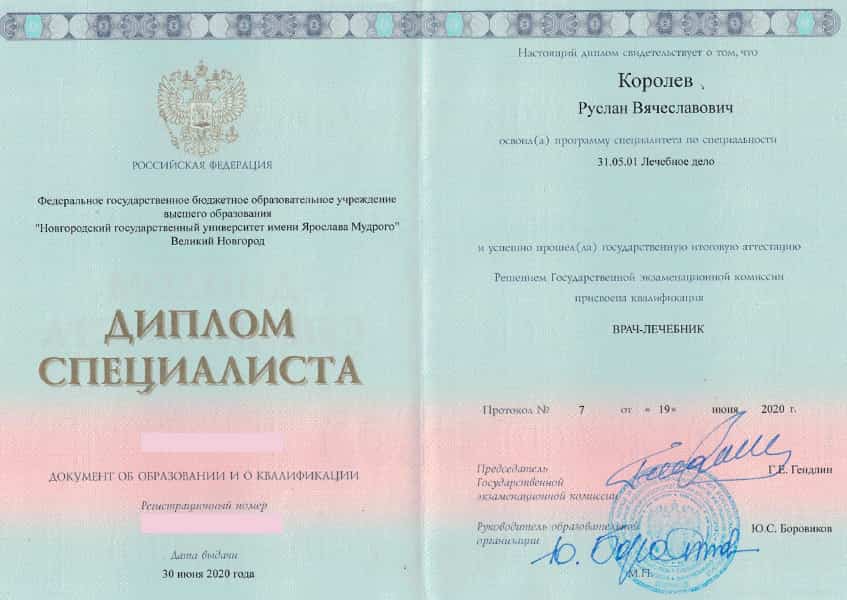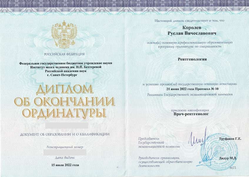 В 2020 году Королев Руслан Вячеславович окончил Новгородский государственный университет по специальности "Лечебное дело". В 2022 в НИИ мозга имени Н.П. Бехтеревой РАН прошел ординатуру по специальности "Лучевая диагностика".