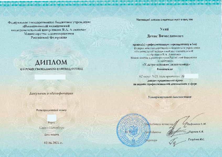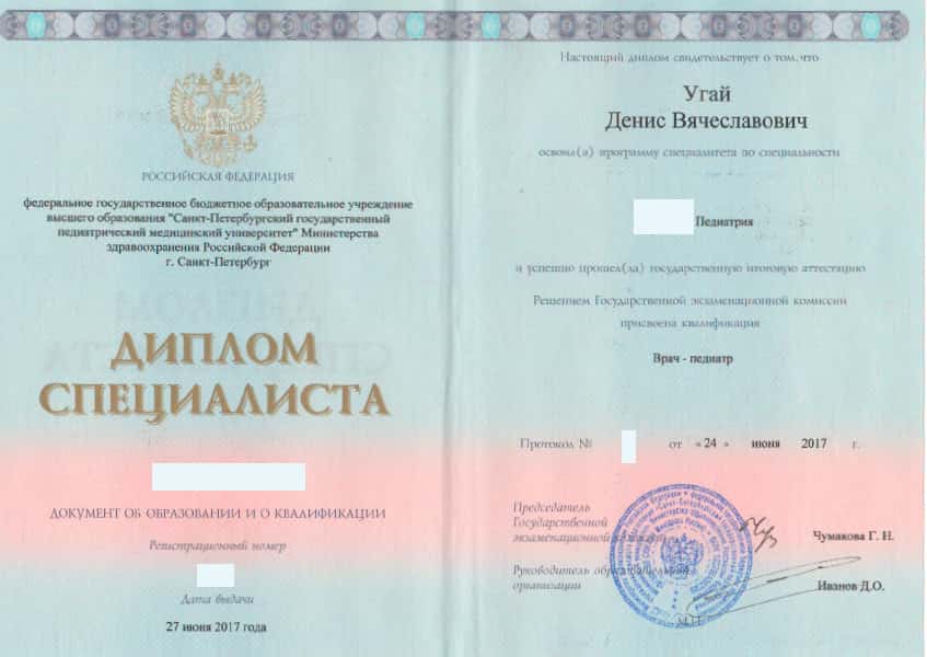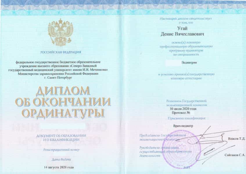 Угай Денис Вячеславович в 2017 году окончил Санкт-Петербургскую государственную педиатрическую медицинскую академию по специальности "Педиатрия". В 2020 году прошел ординатуру в Северо-Западном государственном медицинском университете имени И.И. Мечникова по специальности "Педиатрия".